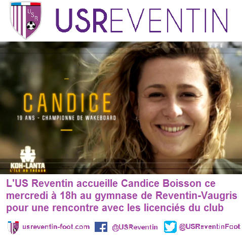 L'US Reventin a le plaisir d’accueillir ce mercredi 18 janvier à 18h, Candice Boisson, quintuple championne de France et vice-championne d'Europe de wakeboard, et récente participante à l’émission télévisée Koh Lanta dans laquelle elle a brillé par ses performances sportives, son intelligence de jeu et sa sympathie.